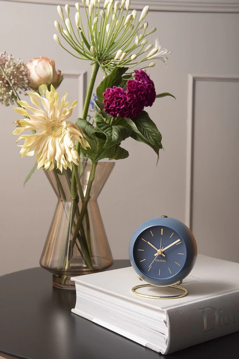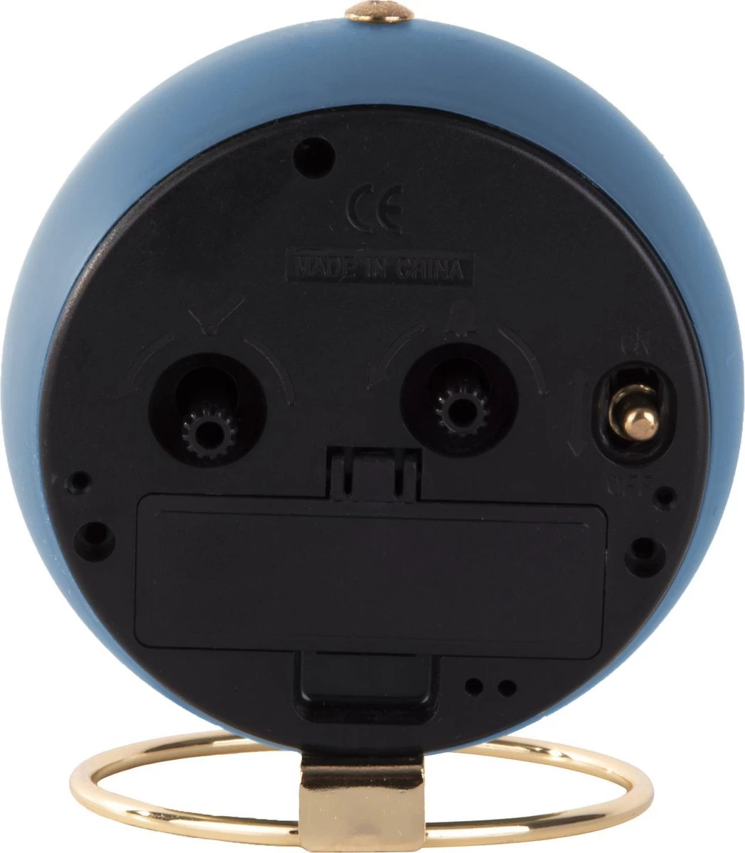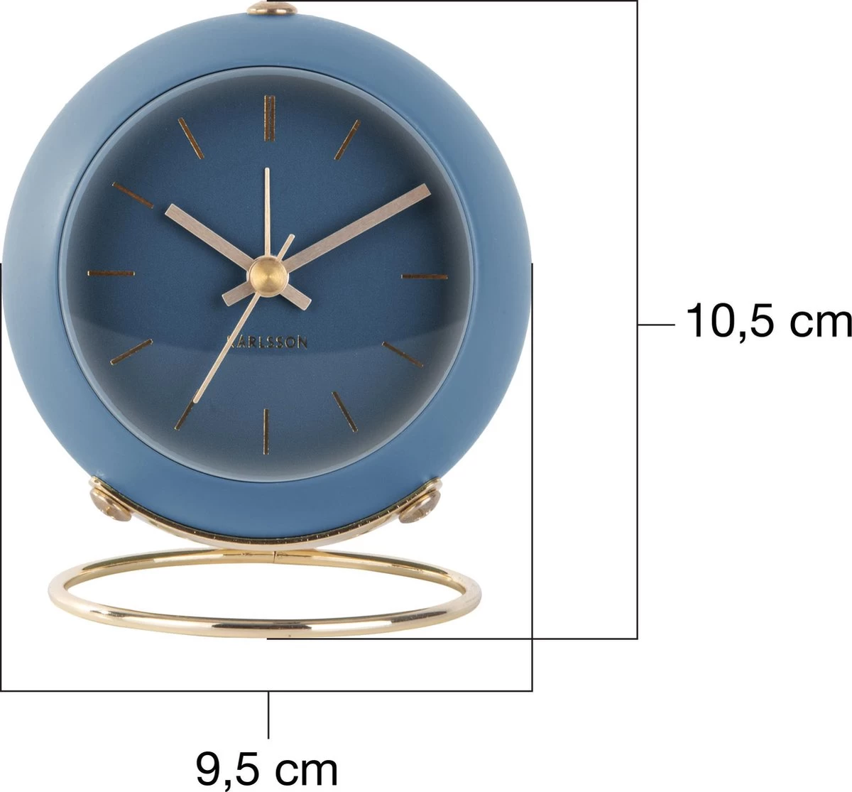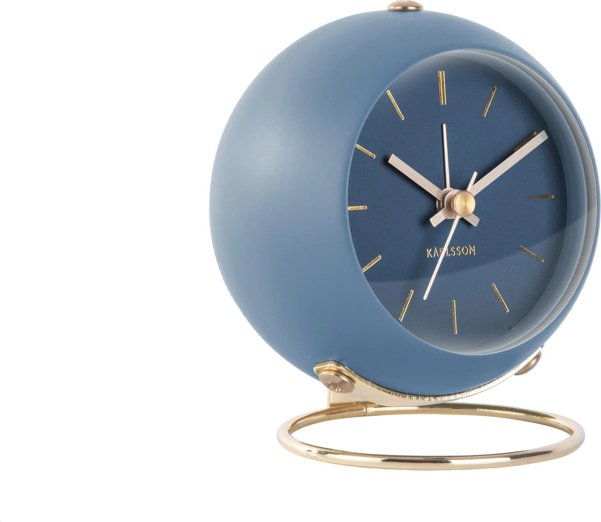 Globe wekker van Karlsson. Chique wekker in het donkerblauw, met goudkleurige details op de wijzerplaat. Door de ronde vorm en goudkleurige voet heeft de Globe wekker een klassieke, stijlvolle uitstraling. Het is een eyecatcher op je nachtkastje! Wekker Globe werkt op 1 AA-batterij (niet inbegrepen). Afmeting: 10,5 x 7 x 9 centimeter.