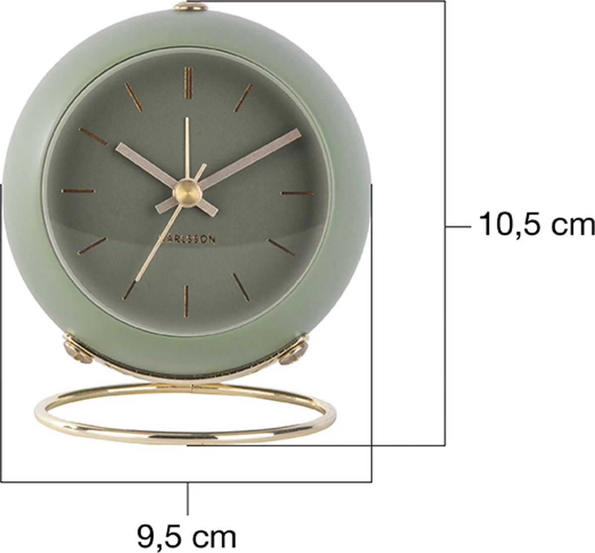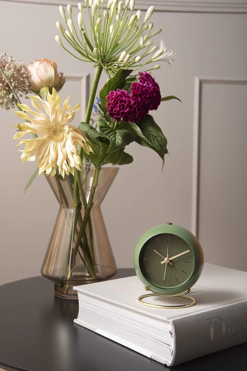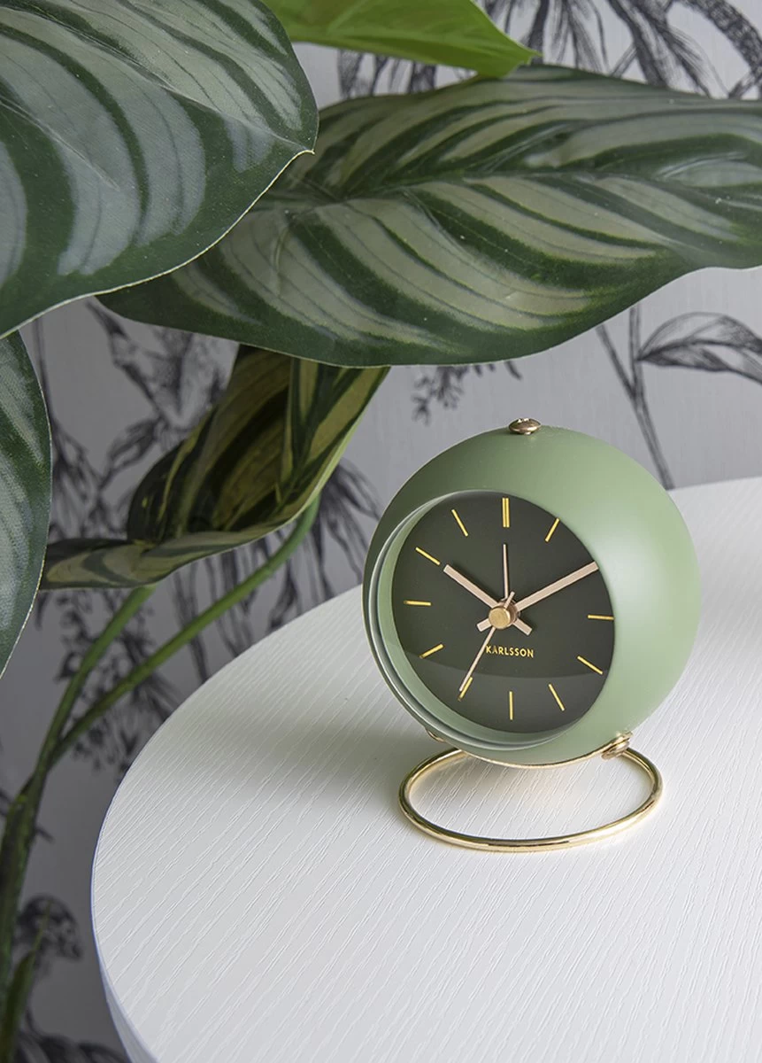 Globe wekker van Karlsson. Chique wekker in het groen, met goudkleurige details op de wijzerplaat. Door de ronde vorm en goudkleurige voet heeft de Globe wekker een klassieke, stijlvolle uitstraling. Het is een eyecatcher op je nachtkastje! Wekker Globe werkt op 1 AA-batterij (niet inbegrepen). Afmeting: 10,5 x 7 x 9 centimeter.
