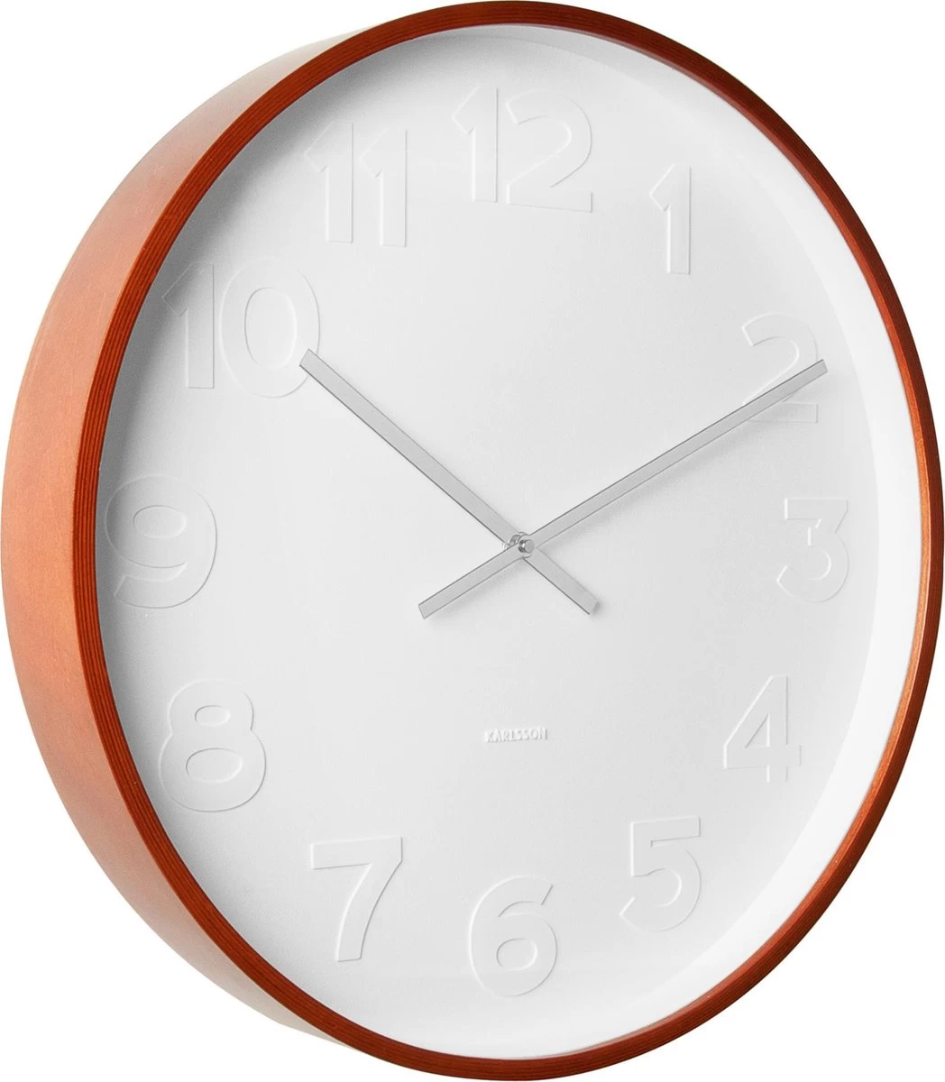 De Karlsson wandklok Mister White numbers heeft een prachtig rustig vormgegeven wijzerplaat. De wijzerplaar is een kunststof witte plaat waarbij de cijfers in het plastic zijn gestanst. Hierdoor hebben de cijfers en de wijzerplaat dezelfde kleur en geeft het een mooi rustig beeld.