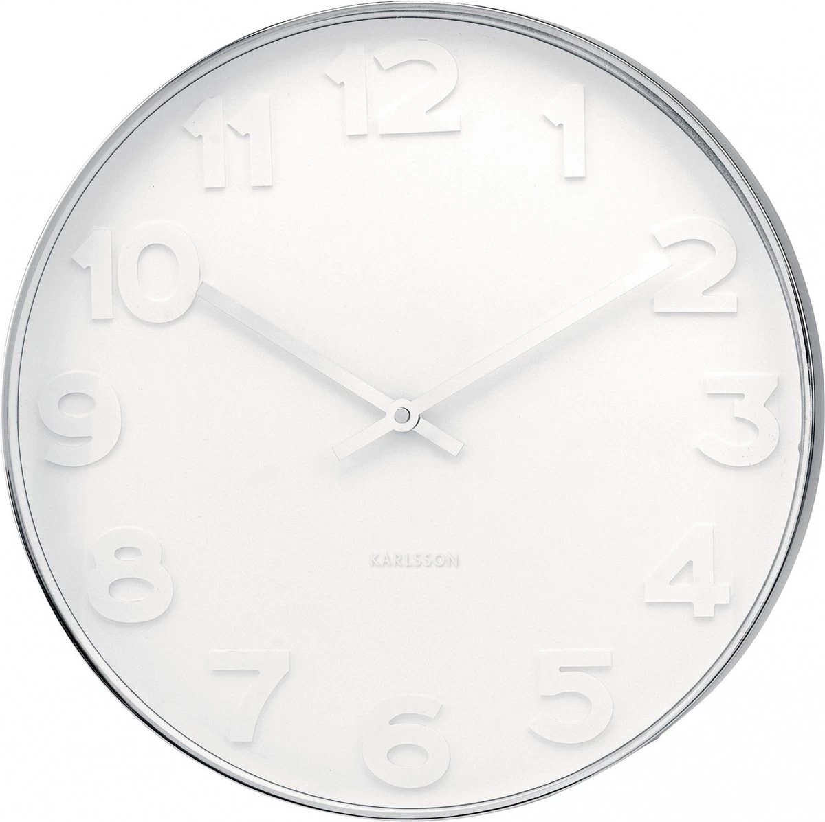 De naam van de Mr. White Numbers wandklok van Karlsson verklapt al waar deze klok zijn frisse look aan dankt: de zilveren wijzers! Deze hebben namelijk dezelfde kleur als de kast. Hierdoor krijg je een mooi, stijlvol effect aan jouw muur. Afmetingen: diameter is 37,5 cm, hoogte is 6 cm. Wordt geleverd exclusief 1 AA batterij. Karlsson klokken en wekkers zijn wereldwijd favoriet.