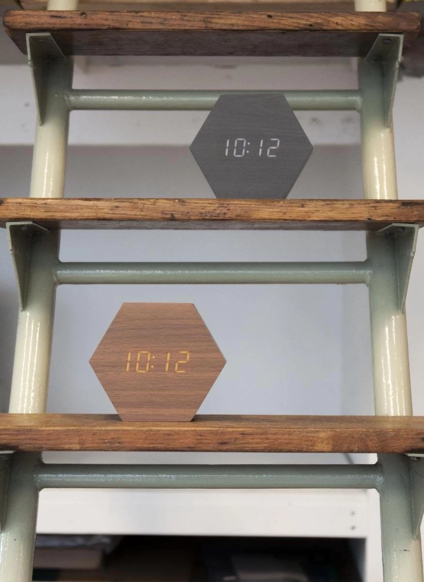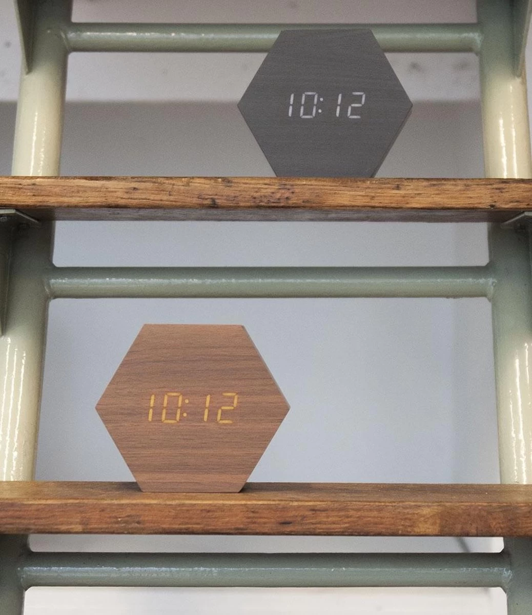 Wakker met een lach? Met wekker Hexagon van Karlsson op je nachtkastje wordt opstaan veel makkelijker. De wekker maakt indruk met een dunne houtfineer laag in zwart of donkerbruin. Deze moderne achthoekige wekker van Karlsson laat met digitale LED cijfers de tijd en de temperatuur zien. De lichtgevende cijfers schijnen prachtig door de houten voorzijde van de wekker. Wekker Hexagon van Karlsson is een prachtig strak, modern en functioneel pareltje op je nachtkastje in de slaapkamer. Een bijzondere mix van natuurlijke en high-tech elementen in een origineel en elegant design.